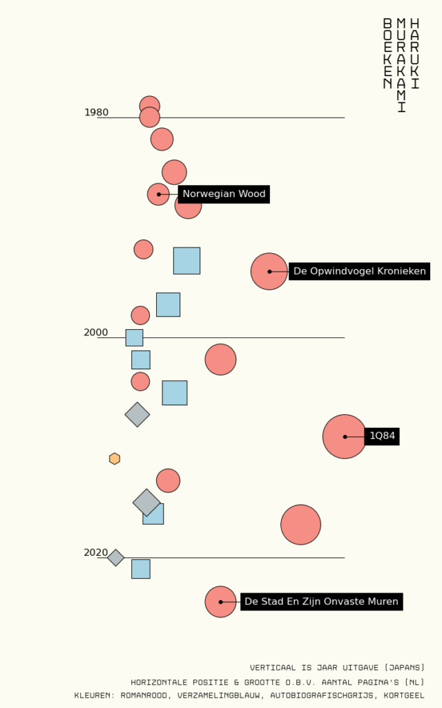 - schrijfgedrag: een gevoel bij de frequentie van publicaties; een indicatie van de publicatie van zijn eerste boek (<1980); idem voor zijn meest recente boek (>2020); Norwegian Wood, zijn bekendste roman, is al een paar decennia oud; hij schrijft vier type boeken; de romanvorm (het rode bolletje) heeft zijn voorkeur.