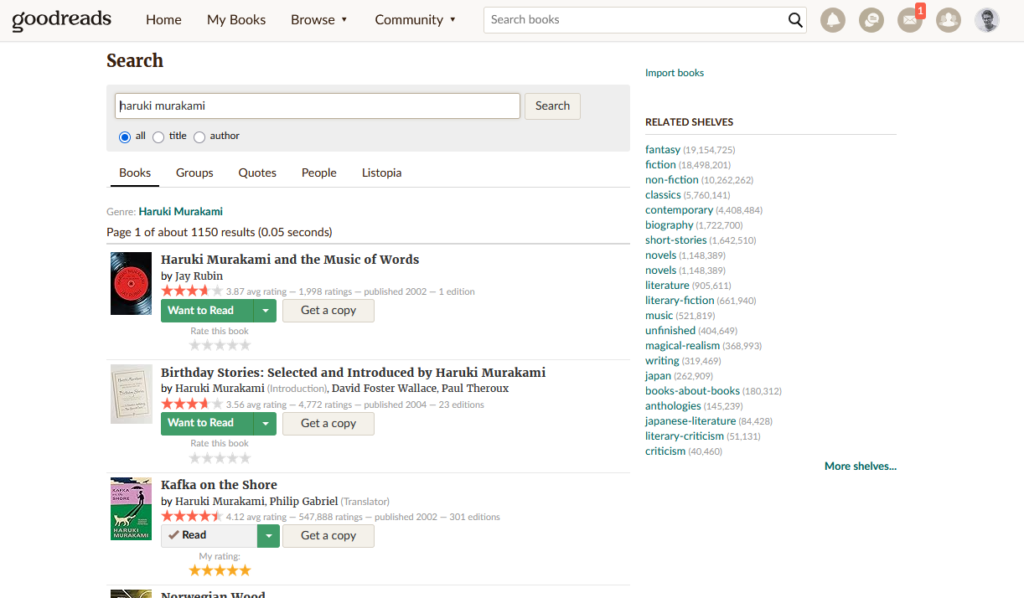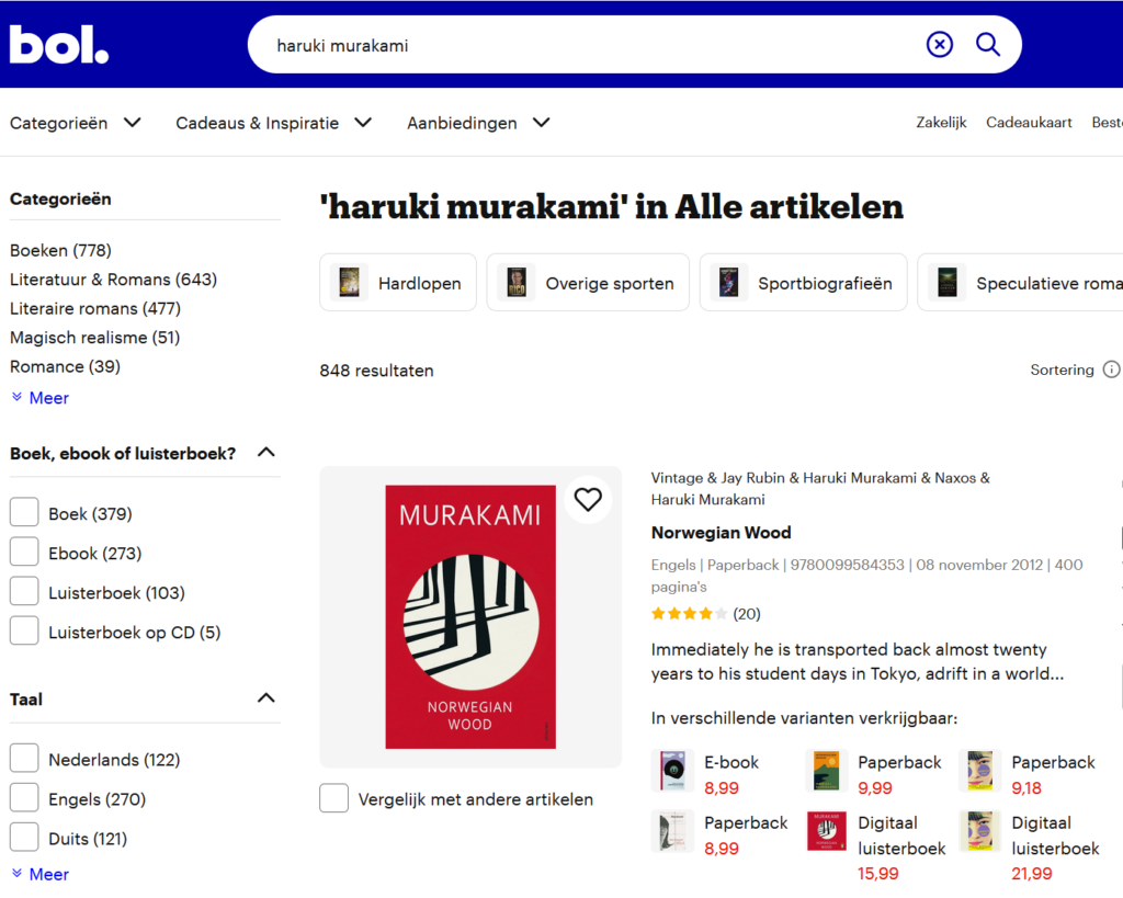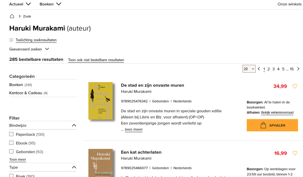 - De zoekbalk suggereert de optie Haruki Murakami (auteur). Libris herkent dat ik een schrijver zoek!