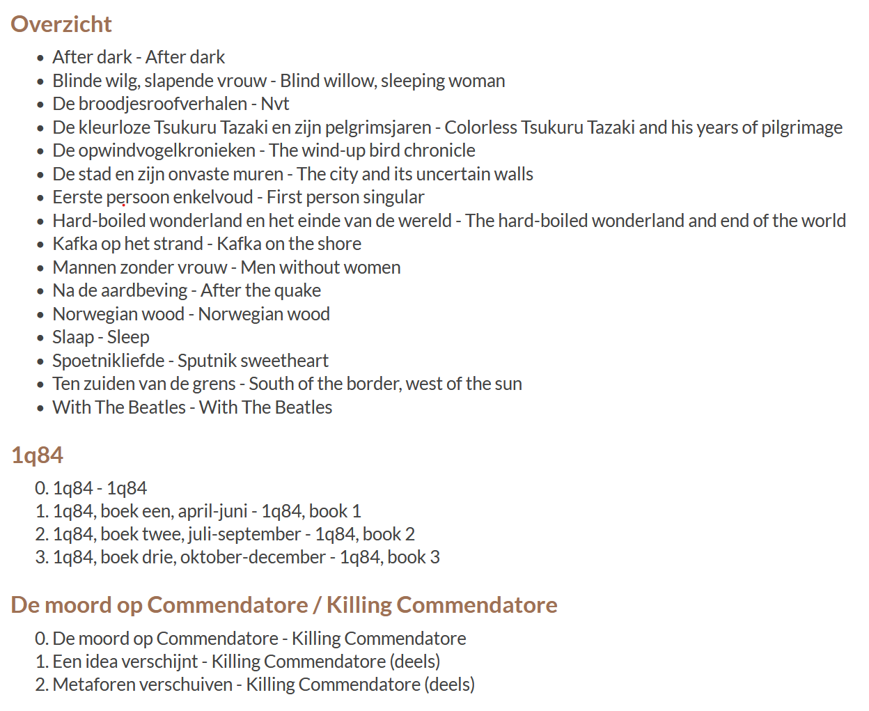 - De lijst tipt bovenin allerlei sportcategorieën en pas later speculatieve romans en (buiten beeld) magisch realisme. Terwijl het genre magisch realisme juist het genre is waar Murakami bekend om staat.