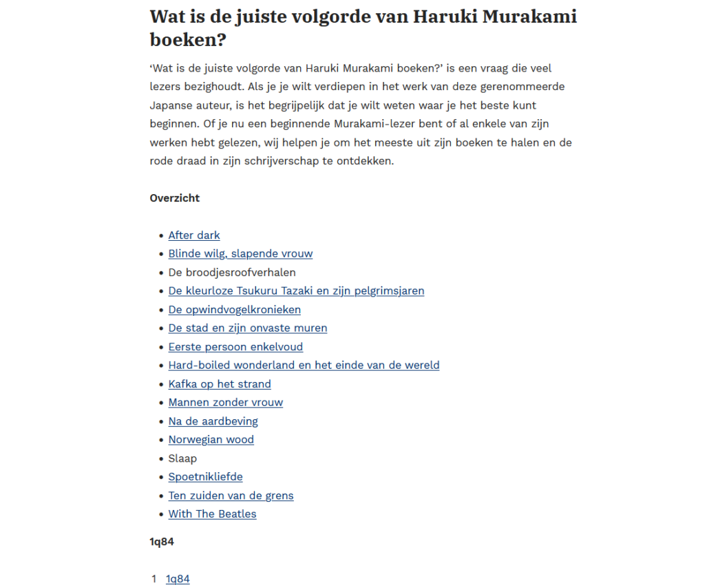 Stel: je hebt een mooi boek gelezen van een auteur. Laten we zeggen die auteur Haruki Murakami is. Je raakt nieuwsgierig naar zijn andere werken. Je gaat op zoek. De eerste lijst die je ziet zijn de zoekresultaten. Deze lijst staat bol van advertenties. Je negeert die advertenties, klikt wat links aan en komt meer lijsten tegen.