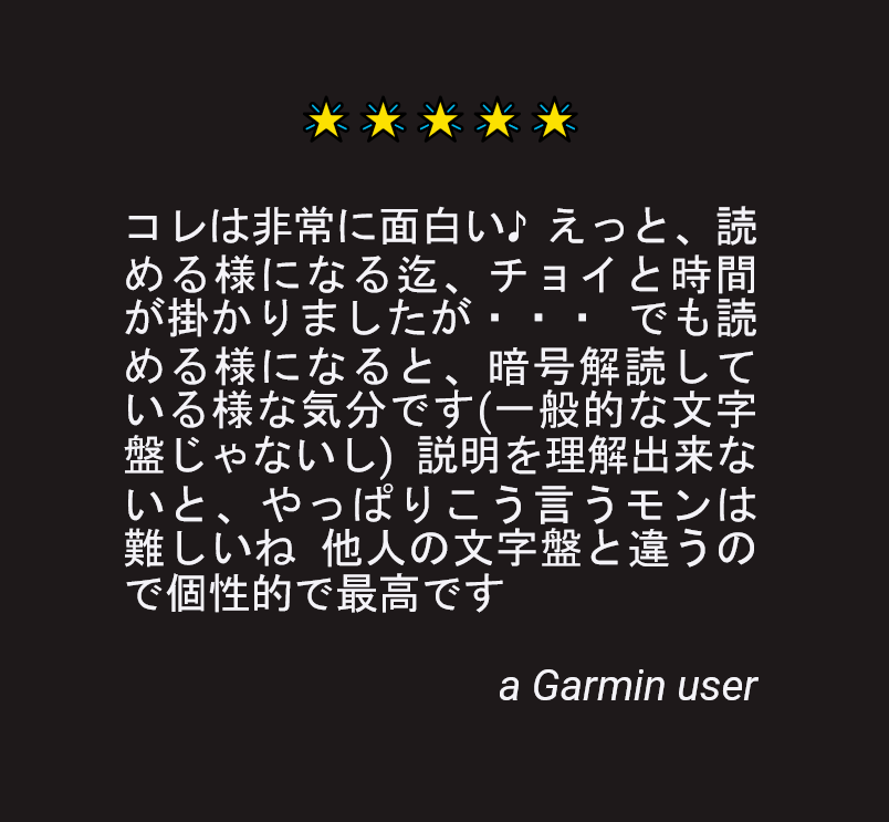 Ik heb deze wijzerplaat ontworpen en geprogrammeerd voor Garmin sport horloges en gebruik het al enkele jaren als mijn standaard wijzerplaats. (Het duurde wel een paar weken totdat de tijd weer snel kon lezen.)