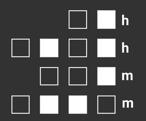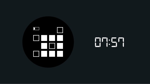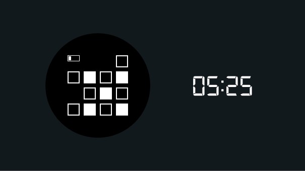 Mijn horloge vertaal bits naar een visueel systeem: iedere bit is een blokje dat aan kan staan (wel gevuld) of uit kan staan (niet gevuld).