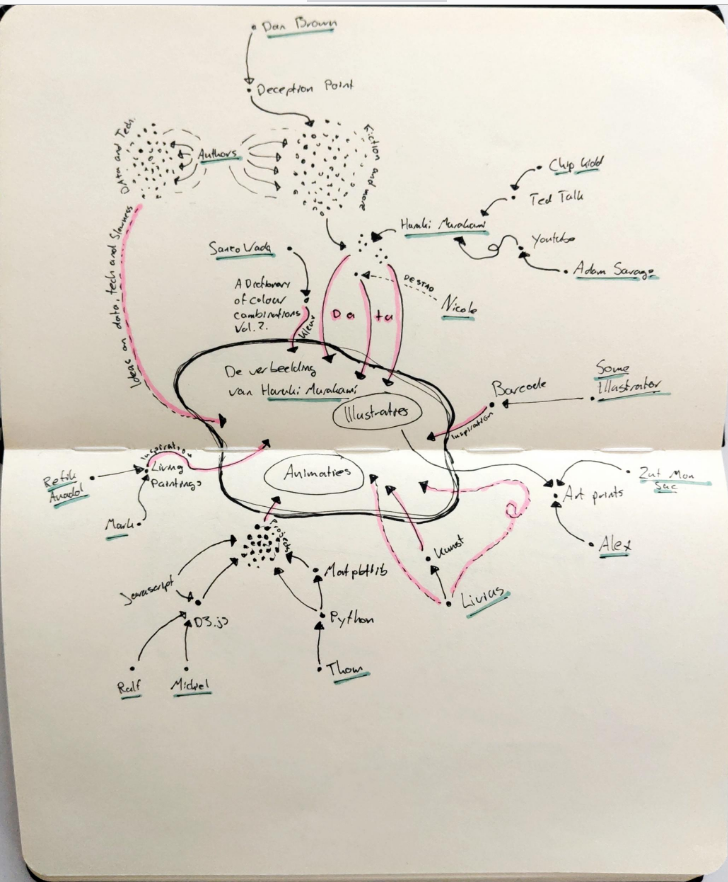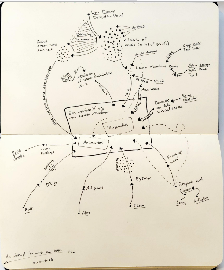 Het laat mooi zien dat er veel nodig is om een idee te laten ontstaan. Zo moet ik om een reeks illustraties over Haruki Murakami te maken om te beginnen een lezer zijn. Dit ben ik ooit geworden door een boek van Dan Brown dat ik tegenkwam. Door dit boek dacht ik He! Kunnen boeken ook leuk zijn?!. Een hoop andere boeken volgden, voorzichtig begon ik meer te lezen, en toen hoorde ik over Haruki Murakami in een TED talk en een youtube video.