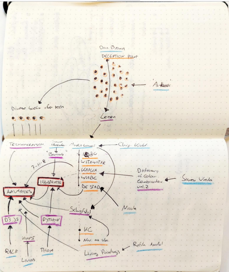Versie drie krijgt daarom een organische vorm in het midden. Daarnaast voeg ik hier weer kleur aan toe: een kleur voor personen die bijdroegen en een kleur voor ideeën met een directe lijn naar het idee: